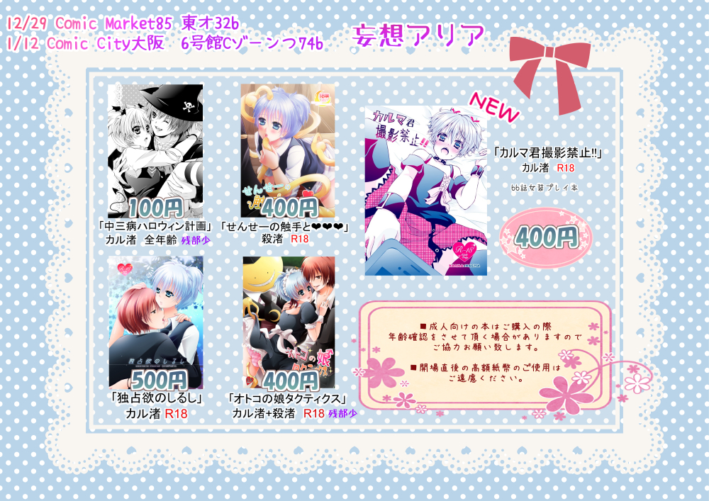 ・頒布物のほとんどが成人向になりますので、場合によっては年齢確認をさせて頂くことがあります。